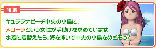 イベント会場の中心にある浅瀬のある小島にいるメローラという人魚からクエストを受注できます♪